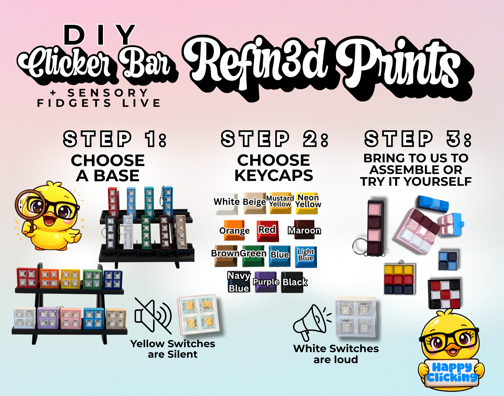 Mix and match colors and choose between silent or loud switches to build your own high-input sensory clicker.